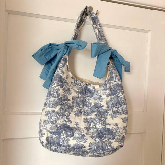 Handmade white and blue porcelain coquette farm print padded tote bag with blue bows